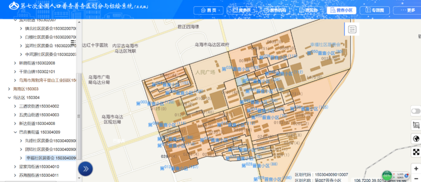 目前,乌海市第七次全国人口普查阶段性工作之建筑标绘已初步完成,现已顺利进行到下一阶段普查小区划分。截至8月25日,乌海市已完成普查小区划分2676个,其中,海勃湾区划分完成1543个普查小区,乌达区划分完成716个普查小区,海南区划分完成417个普查小区。各区普查小区划分工作均在稳步推进中,预计8月28日前可全部完成乌海市普查小区划分阶段性工作。