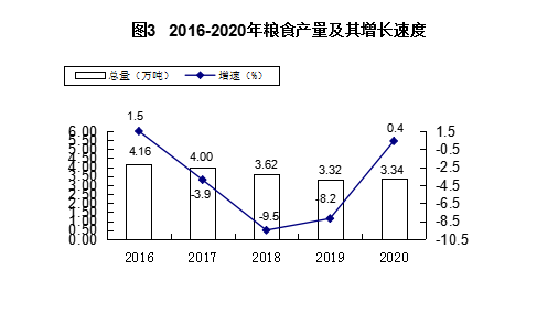 全年农作物总播种面积5699.85公顷,比上年增长0.2%。其中:粮食作物播种面积4326公顷,增长2.8%;经济作物播种面积1373.85公顷,下降7.2%。粮食总产量3.34万吨,增长0.4%;油料产量432.58吨,下降17.8%; 蔬菜及食用菌产量4.63万吨,下降18.6%;瓜果类产量0.25万吨,下降10.3%。园林水果产量1.39万吨,下降16.6%。