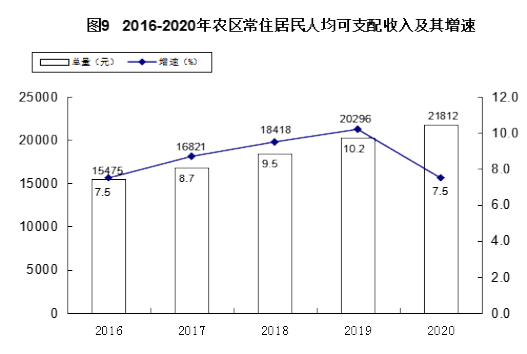 城乡常住居民收入继续增加。全市全体居民人均可支配收入45133元,比上年增长1.7%。按常住地分,城镇常住居民人均可支配收入45497元,比上年增长1.1%;农村牧区常住居民人均可支配收入21812元,比上年增长7.5%。