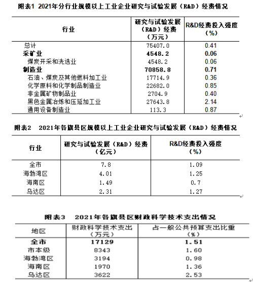 [1]本公报研究与试验发展(R&D)经费数据由乌海市统计局提供,财政科学技术支出数据由乌海市财政局提供,存在总计与分项合计不等的情况。