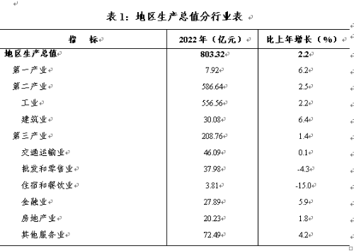 初步核算,全年地区生产总值完成803.32亿元,按可比价格计算,比上年增长2.2%。其中,第一产业增加值7.92亿元,增长6.2%;第二产业增加值586.64亿元,增长2.5%;第三产业增加值208.76亿元,增长1.4%。三次产业结构为1.0:73.0:26.0。第一、二、三产业对地区生产总值增长的贡献率分别为3.1%、75.3%和21.7%。人均地区生产总值达到143450元,比上年增长2.2%。
