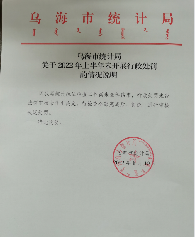 乌海市统计局关于2022年上半年未开展行政处罚的说明情况